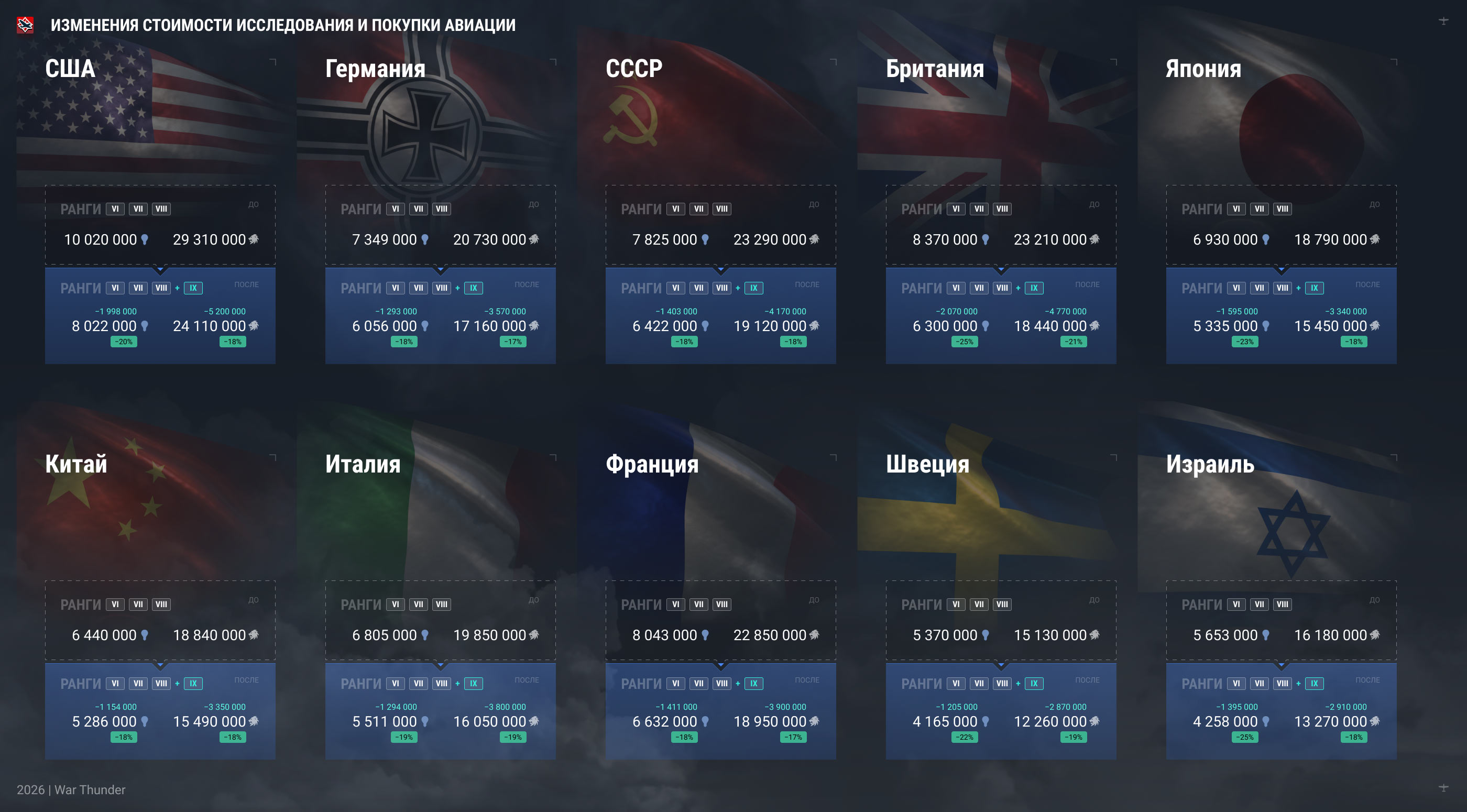 Вместе с добавлением нового IX ранга авиации и связанными с этим перестановками, о которых мы рассказывали ранее, снижены стоимости исследования и покупки авиации VI+ рангов всех игровых наций.